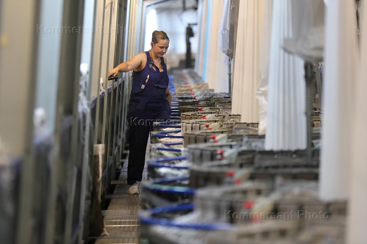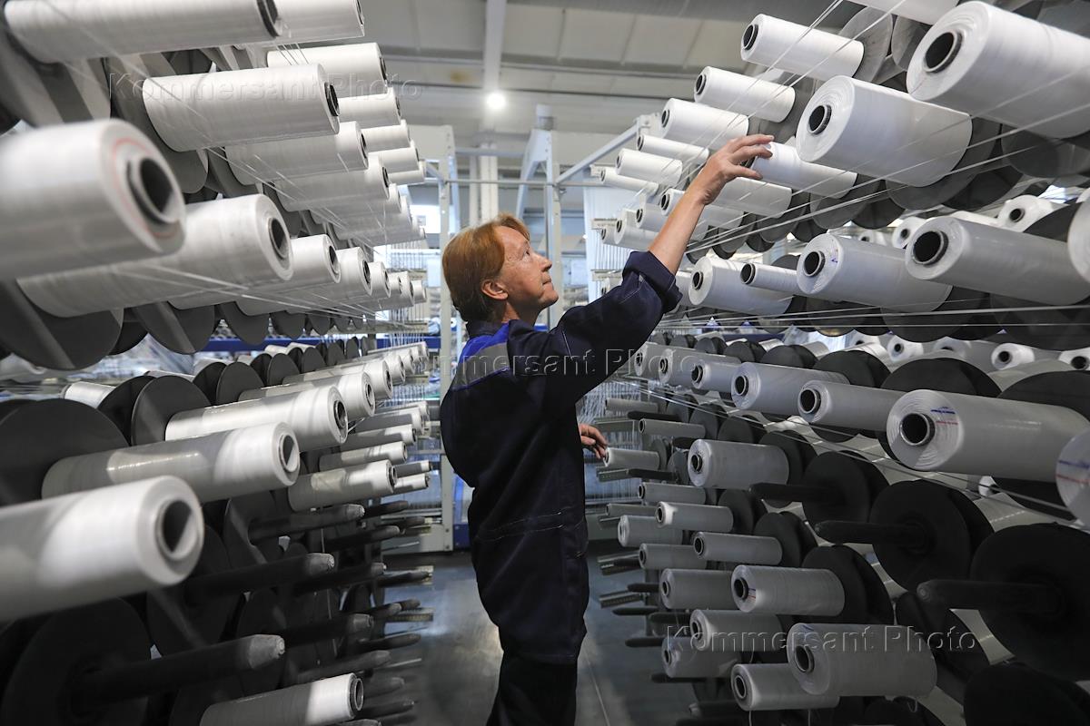 ООО "Волгогпромтранс". Производство промышленной упаковки. Сотрудница во время работы на станках по производству полимерной нити