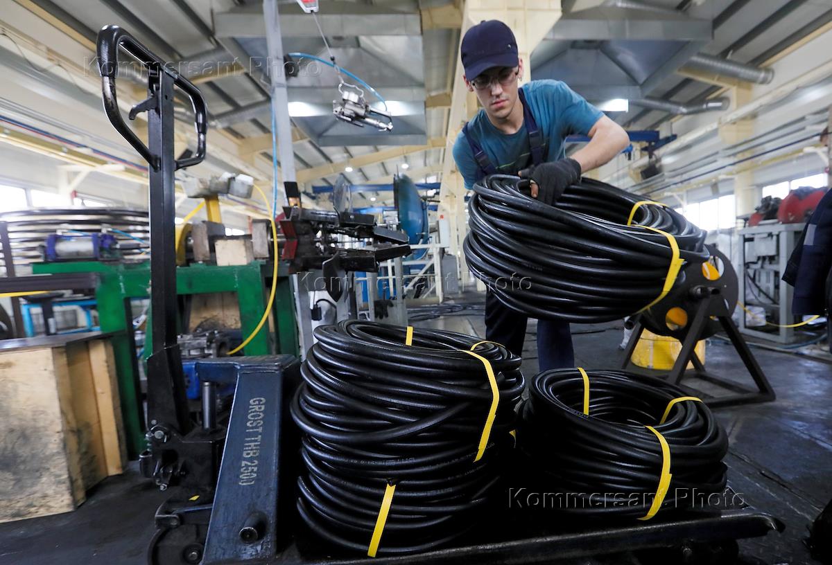 ООО "Волгогпромтранс". Производство промышленной упаковки. Сотрудник во время работы на станке по производству резиновых рукавов.