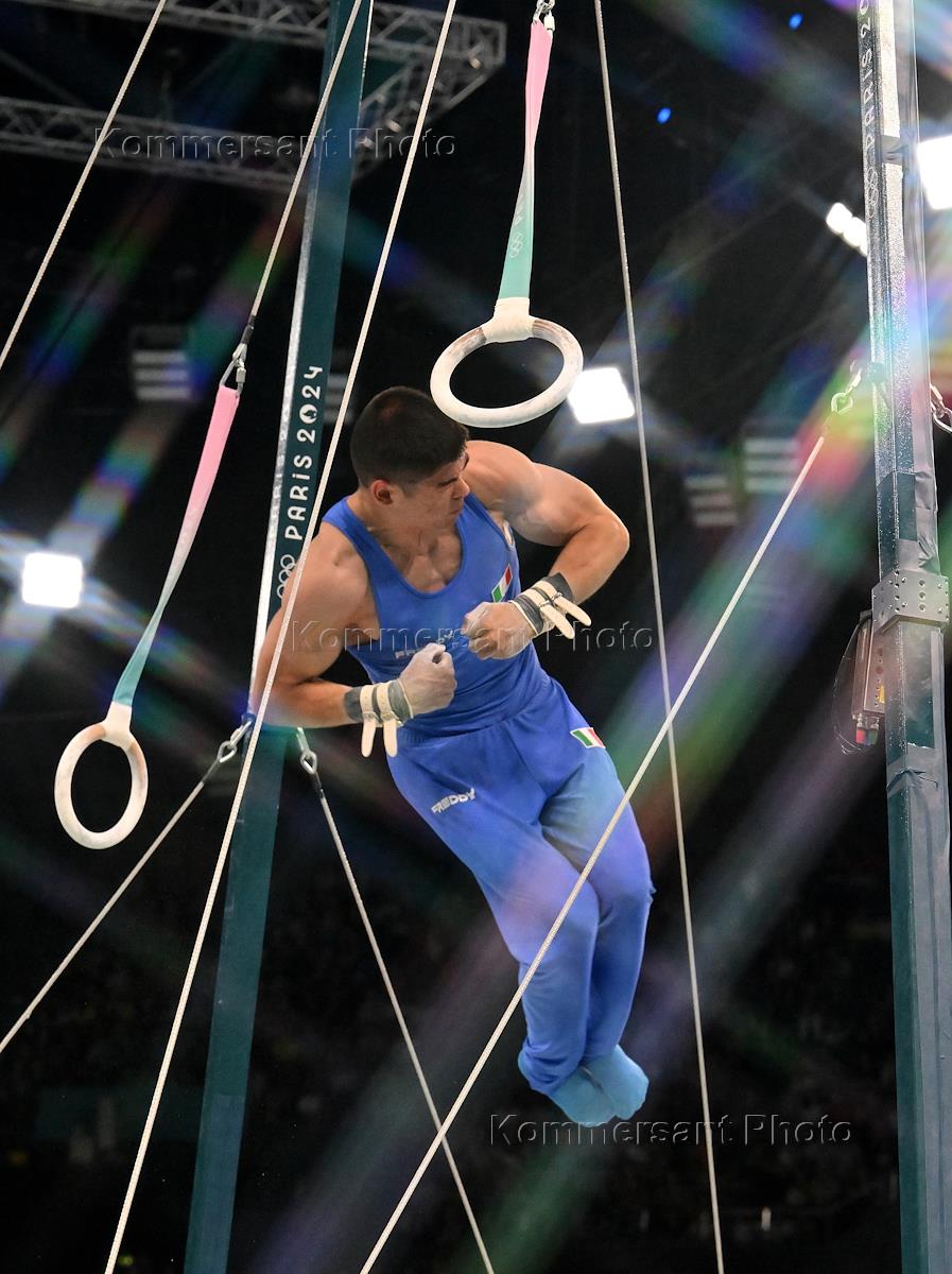 XXXIII Летние Олимпийские игры в Париже. Соревнования по спортивной гимнастике на арене "Берси". Мужчины. Личное многоборье. Итальянский гимнаст Юмин Аббадини во время соревнований.