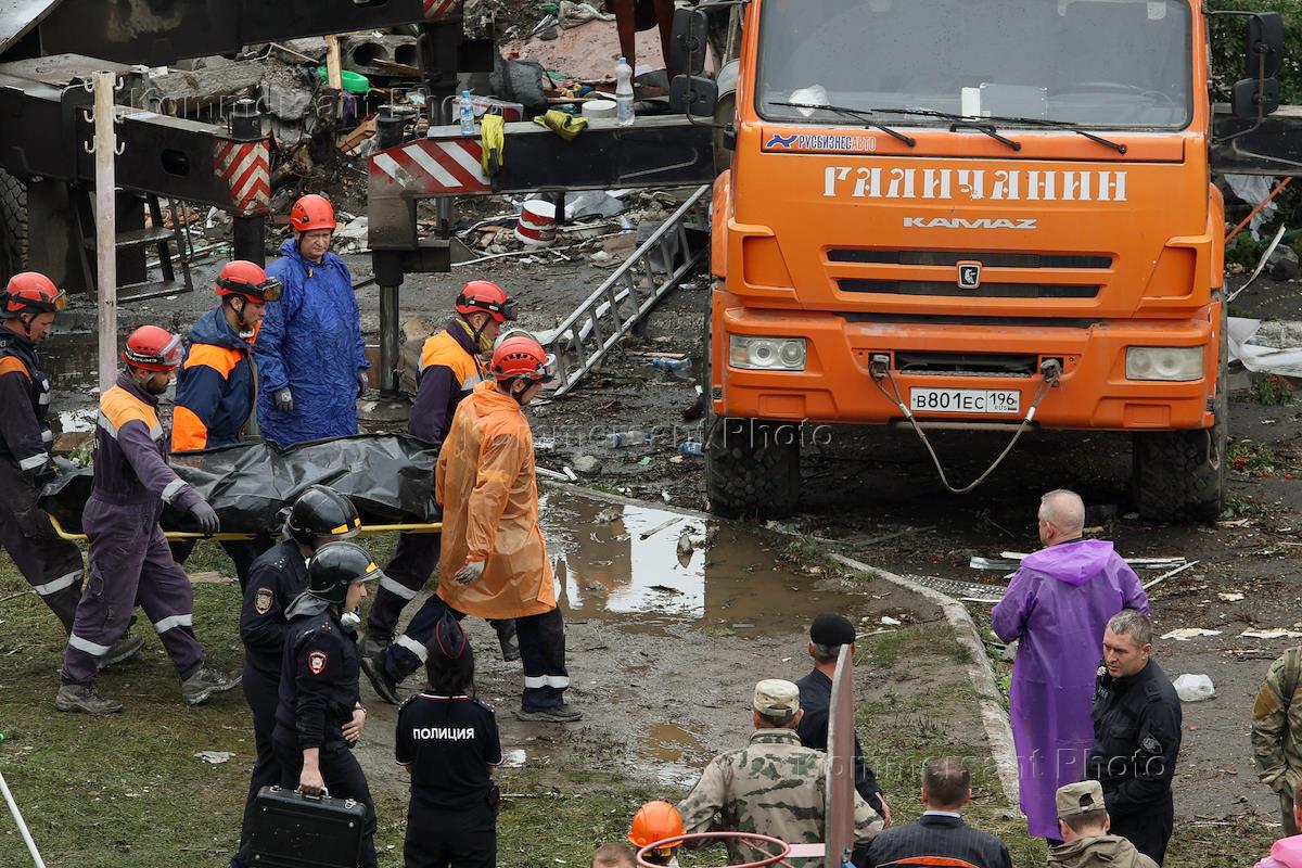Collapse of the entrance to a residential building as a result of a gas cylinder explosion on Sibirskaya Street in Nizhny Tagil. Governor of the Sverdlovsk Region Evgeny Kuyvashev (right) at the site of the collapse.
