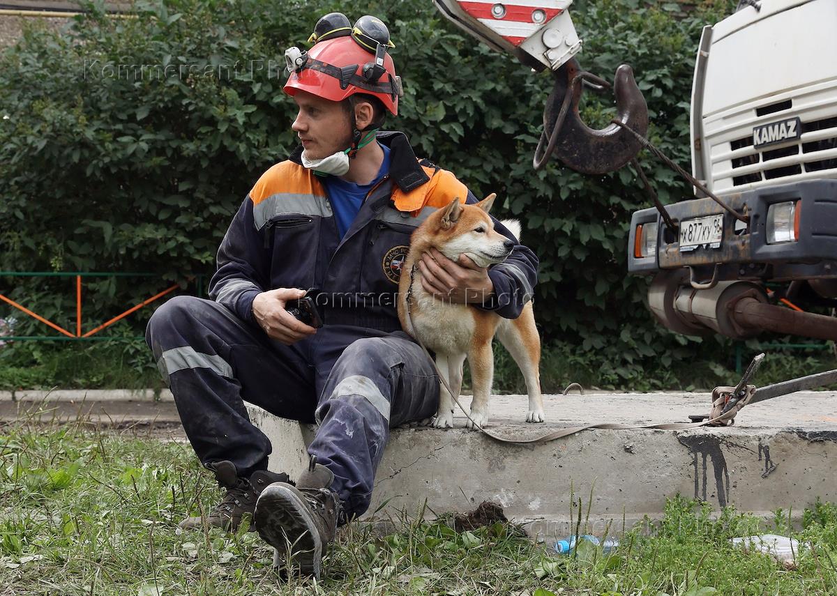 Collapse of the entrance to a residential building as a result of a gas cylinder explosion on Sibirskaya Street in Nizhny Tagil. Mayor of Nizhny Tagil Vladislav Pinaev (right) at the scene.