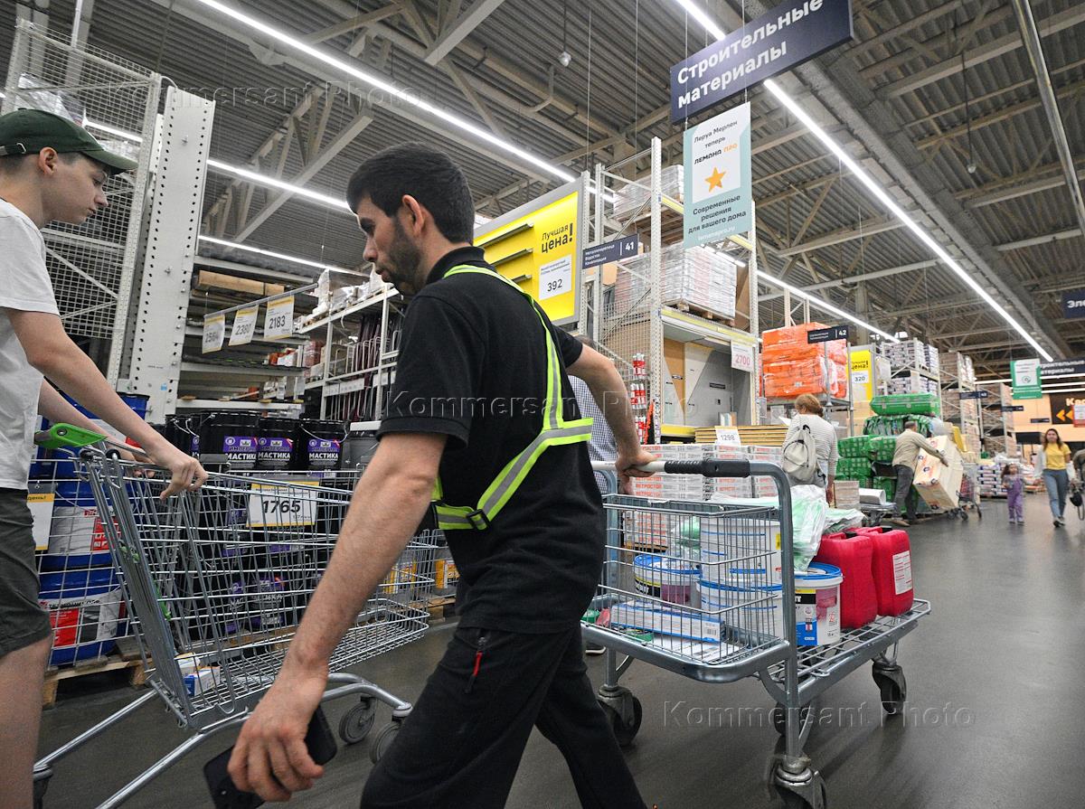 Российский ритейлер "Леруа Мерлен" (Leroy Merlin) сменил название на "Лемана Про" (Lemаna Pro). Строительный гипермаркет "Лемана Про" на Киевском шоссе. Покупатели в очереди на кассе. Жанровая фотография.