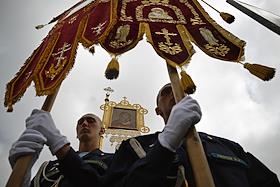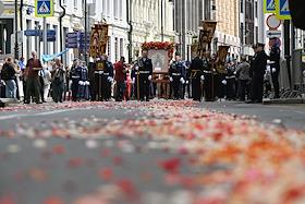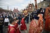 Праздничные мероприятия, посвященные 94-й годовщине создания Воздушно-десантных войск (ВДВ) России, на Красной площади. День ВДВ России отмечают 2 августа в день памяти пророка Илии, небесного покровителя Воздушно-десантных войск. Крестный ход из храма Пророка Божия Илии в Китай-городе до Лобного места на Красной площади. Епископ Истринский, викарий Святейшего Патриарха Московского и всея Руси Серафим во время Крестного хода.