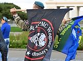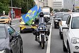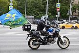 Праздничные мероприятия, посвященные 94-й годовщине создания Воздушно-десантных войск (ВДВ) России, в Парке Горького. Бывший десантник на мотоцикле с флагом ВДВ едет по Крымскому валу.