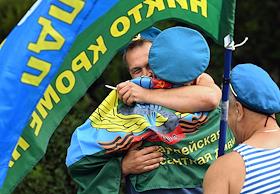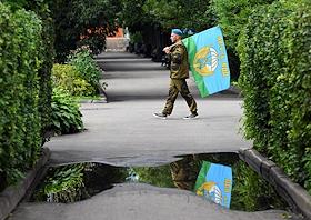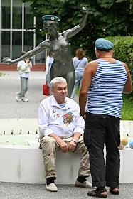 Праздничные мероприятия, посвященные 94-й годовщине создания Воздушно-десантных войск (ВДВ) России, в Парке Горького. Бывший десантник и курсант десантного училища во время гуляний в парке.