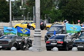 Праздничные мероприятия, посвященные 94-й годовщине создания Воздушно-десантных войск (ВДВ) России, в Парке Горького. жанровая фотография. Припаркованный автомобили у парка с флагами ВДВ.