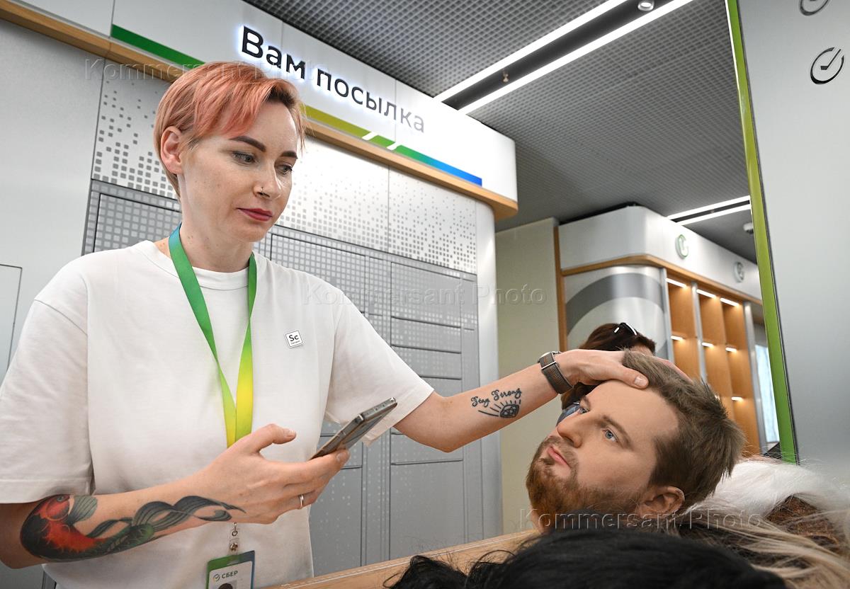 Краш-тест биометрии при "оплате улыбкой" в отделении Сбера на Цветном бульваре. Жанровая фотография.