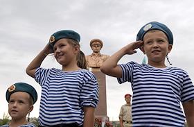 Праздничные мероприятия, посвященные 94-й годовщине создания Воздушно-десантных войск (ВДВ) России, в Донецке. Жанровая фотография. Церемония возложения цветов к памятнику Герою Советского Союза, генералу армии Василию Маргелову.