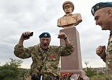 Праздничные мероприятия, посвященные 94-й годовщине создания Воздушно-десантных войск (ВДВ) России, в Донецке. Жанровая фотография. Ветераны ВДВ у памятника Герою Советского Союза, генералу армии Василию Маргелову.