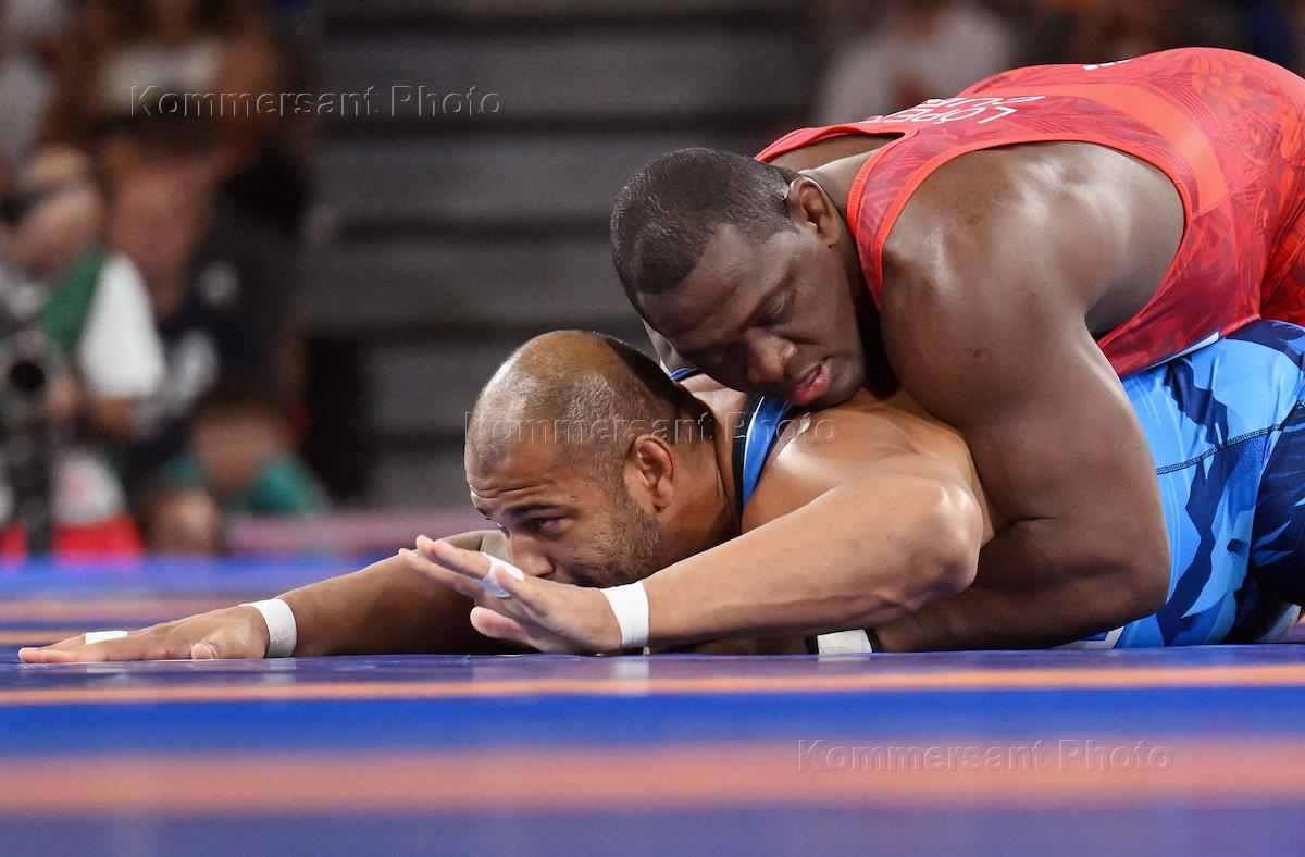 XXXIII Летние Олимпийские игры в Париже. Греко-римская борьба Мужчины. До 130 кг. Финал на арене "Марсово поле". Кубинский борец Михаин Лопес Нуньес (справа) и чилийский борец Ясмани Акоста Фернандес (слева) во время поединка.