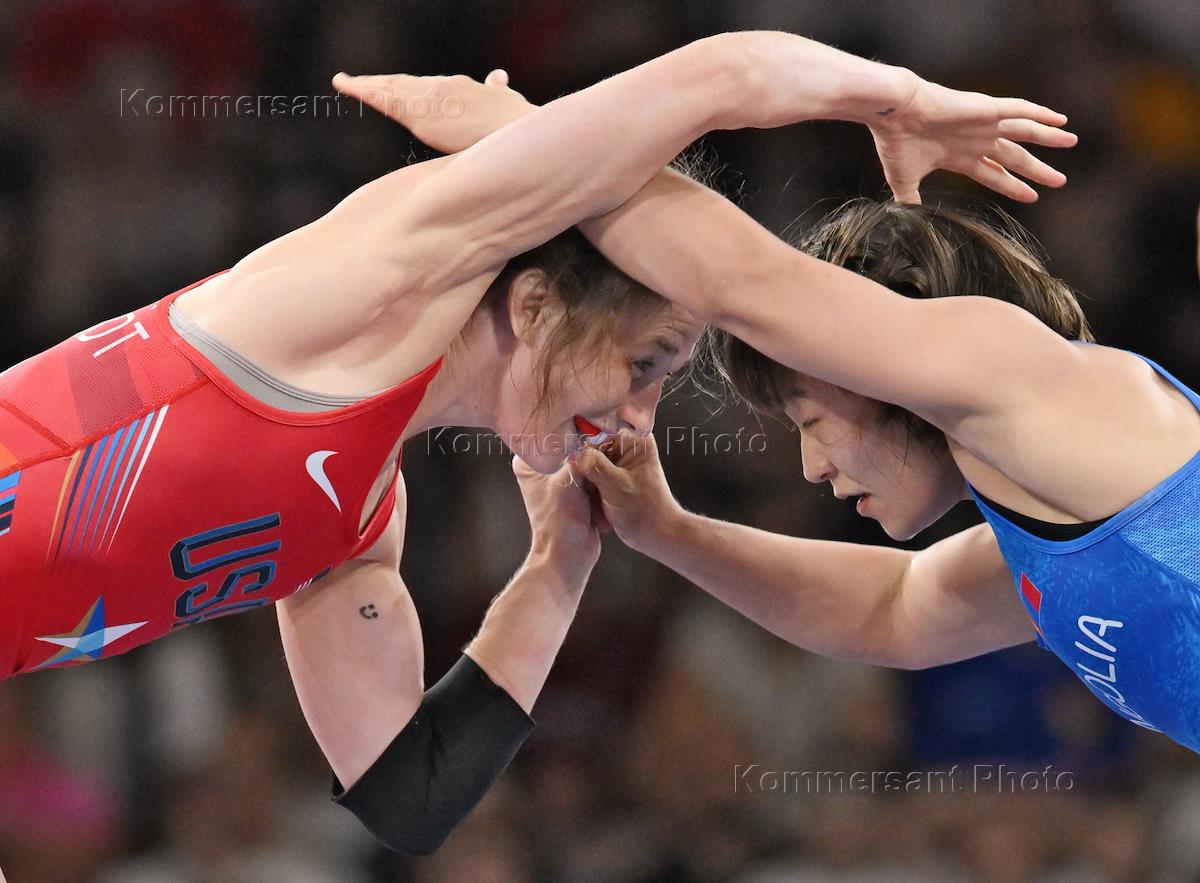 XXXIII Летние Олимпийские игры в Париже. Соревнования по борьбе на арене "Марсово поле". Вольная борьба. Женщины. 50 кг. Полуфинал. Монгольская спортсменка Отгонджарргал Долгожав (слева) и американская спортсменка Сара Энн Хильдебрандт (справа) во время поединка.