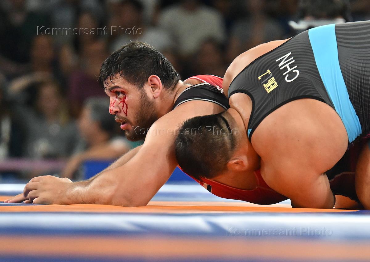 XXXIII Summer Olympic Games in Paris. Wrestling competitions at the Field of Mars arena. Greco-Roman wrestling. Men. 60 kg. Fights for third place. Kyrgyz wrestler Zholaman Sharshenbekov (right) and Iranian wrestler Mehdi Mohsen Nejad (left) during a fight.