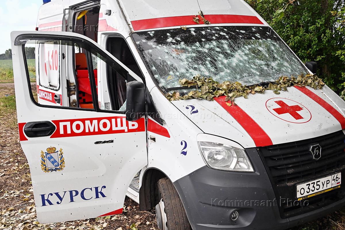 Ситуация в Курской области после обстрела ВСУ. Разбитый после обстрела дронами автомобиль скорой медицинской помощи под городом Суджа.