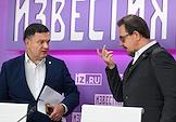 Заседание "круглого стола" Экспертного института социальных исследований (ЭИСИ) на тему: "Месяц до выборов: партийная активность и конкуренция" в пресс-центре МИЦ "Известия". Представитель в Совете Федерации России от исполнительного органа государственной власти Ленинградской области Сергей Перминов (слева) и первый заместитель председателя комиссии Общественной палаты России по общественной экспертизе законопроектов и иных нормативных актов, политолог Александр Асафов (справа) после "круглого стола".