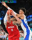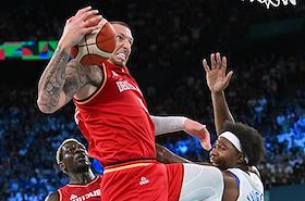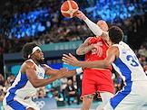 XXXIII Летние Олимпийские игры в Париже. Баскетбол. Мужчины. Полуфинал. Матч между сборными командами Франции и Германии на арене "Берси". Игроки сборной Германии Йоханес Тиман (слева) во время матча.