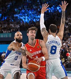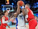 XXXIII Летние Олимпийские игры в Париже. Баскетбол. Мужчины. Полуфинал. Матч между сборными командами Франции и Германии на арене "Берси". Игроки сборной Франции Эван Фурнье (слева), Исайя Кординье (справа) и игрок сборной Германии Франц Вагнер (в центре) во время матча.