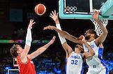 XXXIII Летние Олимпийские игры в Париже. Баскетбол. Мужчины. Полуфинал. Матч между сборными командами Франции и Германии на арене "Берси". Игроки сборной Франции Руди Гобер (в центре) и игрок сборной Германии Деннис Шредер (справа) во время матча.