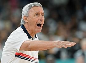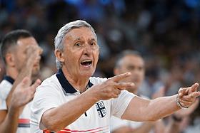 XXXIII Летние Олимпийские игры в Париже. Арена "Берси". Баскетбол. Мужчины. Полуфинал. Матч между сборными командами США и Сербии. Главный тренер сборной Сербии по баскетболу Светислав Пешич во врем матча.