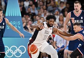 XXXIII Летние Олимпийские игры в Париже. Арена "Берси". Баскетбол. Мужчины. Полуфинал. Матч между сборными командами США и Сербии. Игрок сборной США Джоэл Эмбиид (в центре) во время матча.