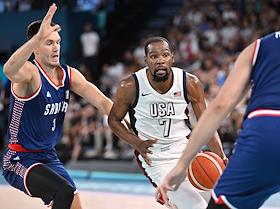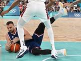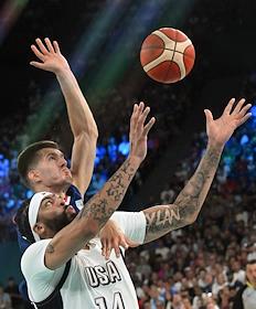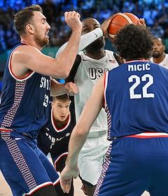 XXXIII Летние Олимпийские игры в Париже. Арена "Берси". Баскетбол. Мужчины. Полуфинал. Матч между сборными командами США и Сербии. Игрок сборной Сербии Богдан Богданович (в центре) во время матча.