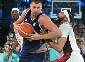 XXXIII Летние Олимпийские игры в Париже. Арена "Берси". Баскетбол. Мужчины. Полуфинал. Матч между сборными командами США и Сербии. Игрок сборной Сербии Никола Йокич во время матча.
