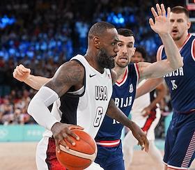 XXXIII Летние Олимпийские игры в Париже. Арена "Берси". Баскетбол. Мужчины. Полуфинал. Матч между сборными командами США и Сербии. Игрок сборной США Леброн Джеймс (в центре) во время матча.
