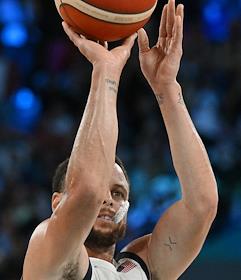XXXIII Летние Олимпийские игры в Париже. Арена "Берси". Баскетбол. Мужчины. Полуфинал. Матч между сборными командами США и Сербии. Игрок сборной США Стефан Карри во время матча.