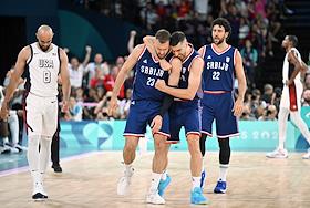 XXXIII Летние Олимпийские игры в Париже. Арена "Берси". Баскетбол. Мужчины. Полуфинал. Матч между сборными командами США и Сербии. Игрок сборной Сербии Василие Мицич (в центре) после матча.