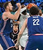 XXXIII Летние Олимпийские игры в Париже. Арена "Берси". Баскетбол. Мужчины. Полуфинал. Матч между сборными командами США и Сербии. Игрок сборной Сербии Филипп Петрушев (в центре) во время матча.