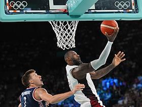 XXXIII Летние Олимпийские игры в Париже. Арена "Берси". Баскетбол. Мужчины. Полуфинал. Матч между сборными командами США и Сербии. Игрок сборной США Леброн Джеймс во время матча.