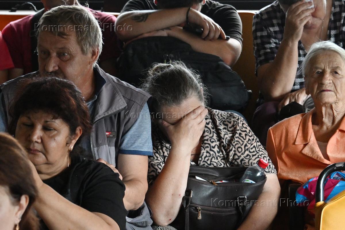 The situation in the Kursk region after the shelling of the Ukrainian Armed Forces. A line of evacuated residents of the border areas of the Kursk region, victims of shelling at the NPO "House of Good Deeds".