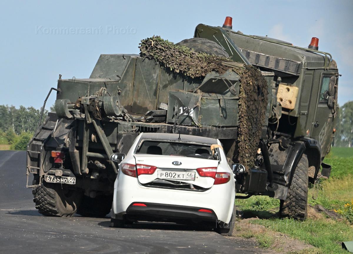Ситуация в Курской области после обстрела ВСУ. Военная техника. Колонна грузовых автомобилей, пострадавшая от обстрела на трассе.