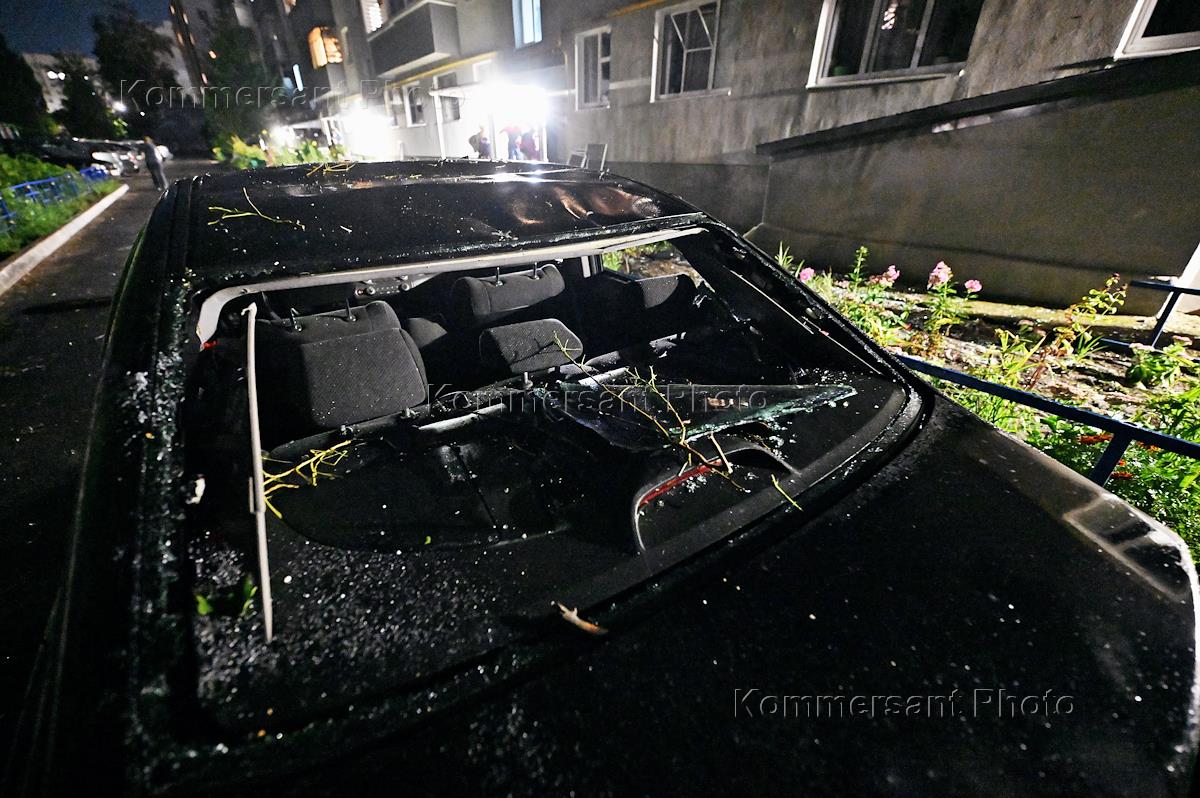 The situation in the Kursk region. Consequences of a downed Ukrainian Armed Forces (AFU) missile falling on a residential multi-storey building in the Zheleznodorozhny District of Kursk. Broken car windshield.