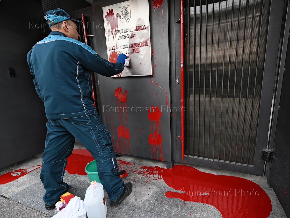 Табличка на здании Посольства Литвы в Москве, облитая красной краской. Жанровая фотография. Сотрудник технической службы Посольства стирает краску с таблички.