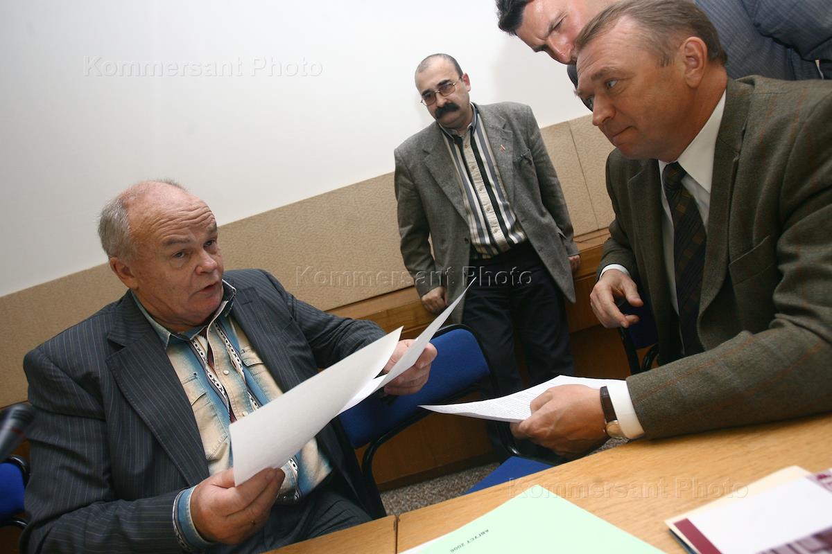 Russian Public Chamber Secretary, academician Yevgeny Velikhov, center, and Russian Public Chamber member, Russian Trade and Industrial Chamber Vice President, right, attend round table meeting devoted to Russian Public Chamber work analisys and further strategy.