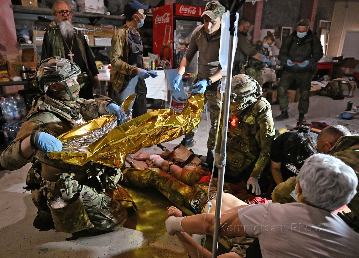 Ситуация в Курской области после обстрела ВСУ. Волонтерский полевой медицинский пункт для раненых местных жителей и военных в Курской области. Медицинские работники во время оказания первой медицинской помощи раненому военному.