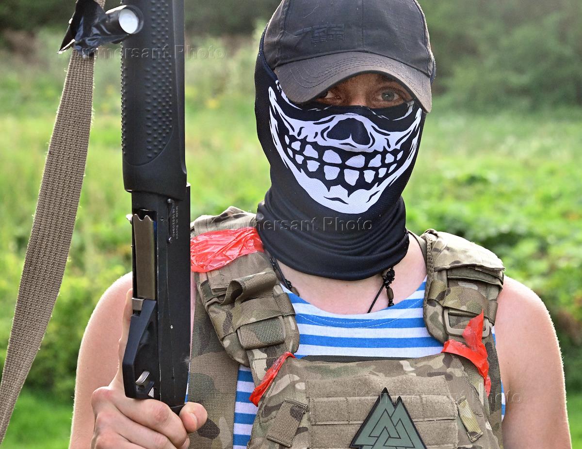 Ситуация в Курской области после обстрела ВСУ. Жанровая фотография. Военные в бронежилете и с камуфляжной маской на лице.