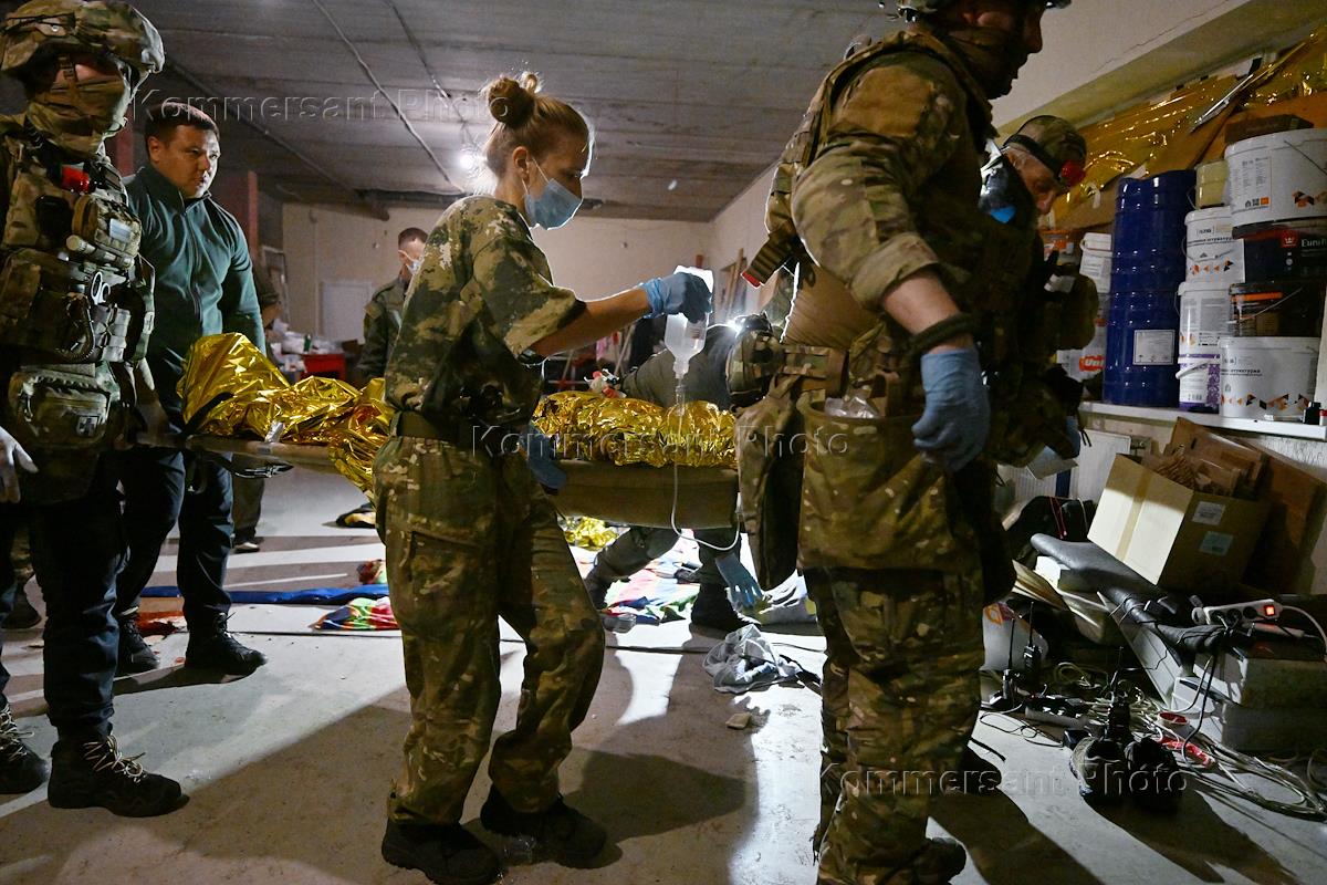 Ситуация в Курской области после обстрела ВСУ. Волонтерский полевой медицинский пункт для раненых местных жителей и военных в Курской области. Медицинские работники во время оказания первой медицинской помощи раненому военному.