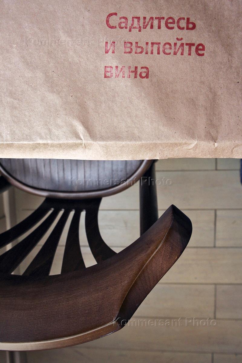Интерьер ресторана "Простые вещи" на Конюшковской улице. Надпись на скатерти "Садитесь и выпейте вина".