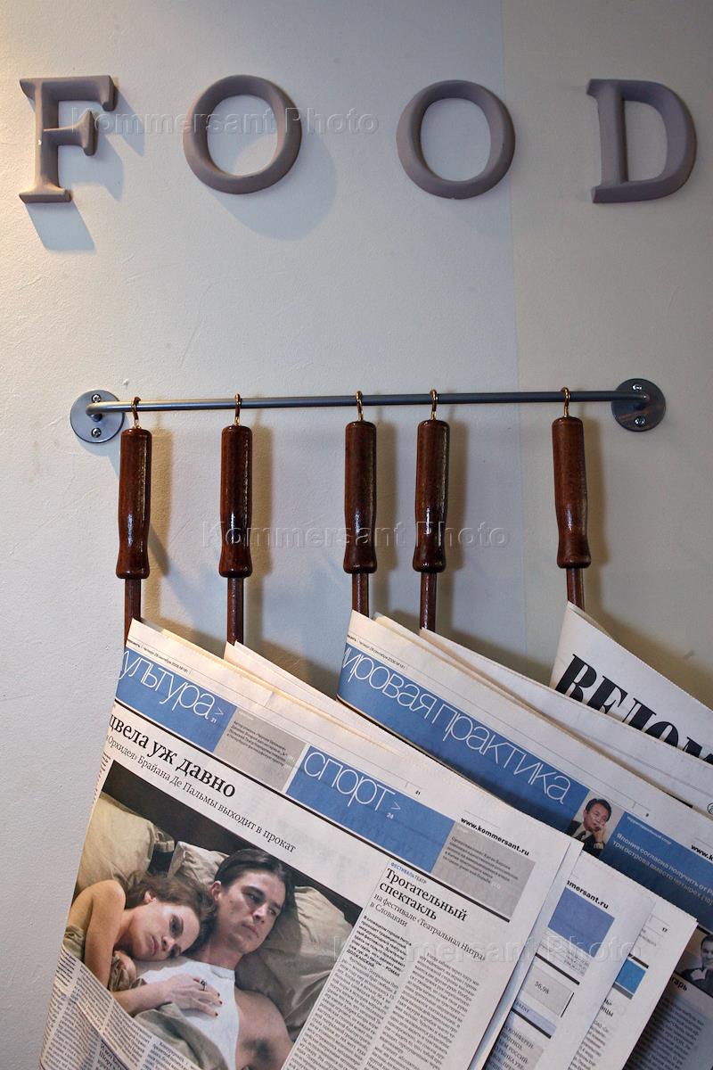 Интерьер ресторана "Простые вещи" на Конюшковской улице. Стенд со свежими газетами.