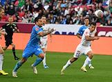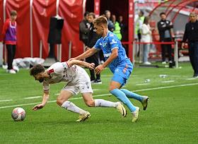 Фонбет - Кубок России по футболу 2024/25. Матч между командами "Рубин" (Казань) - "Зенит" (Санкт-Петербург) на стадионе "Ак Барс Арена". Игрок команды "Зенит" Юрий Горшков (справа) и игрок команды "Рубин" Дардан Шабанхаджай (слева) во время матча.