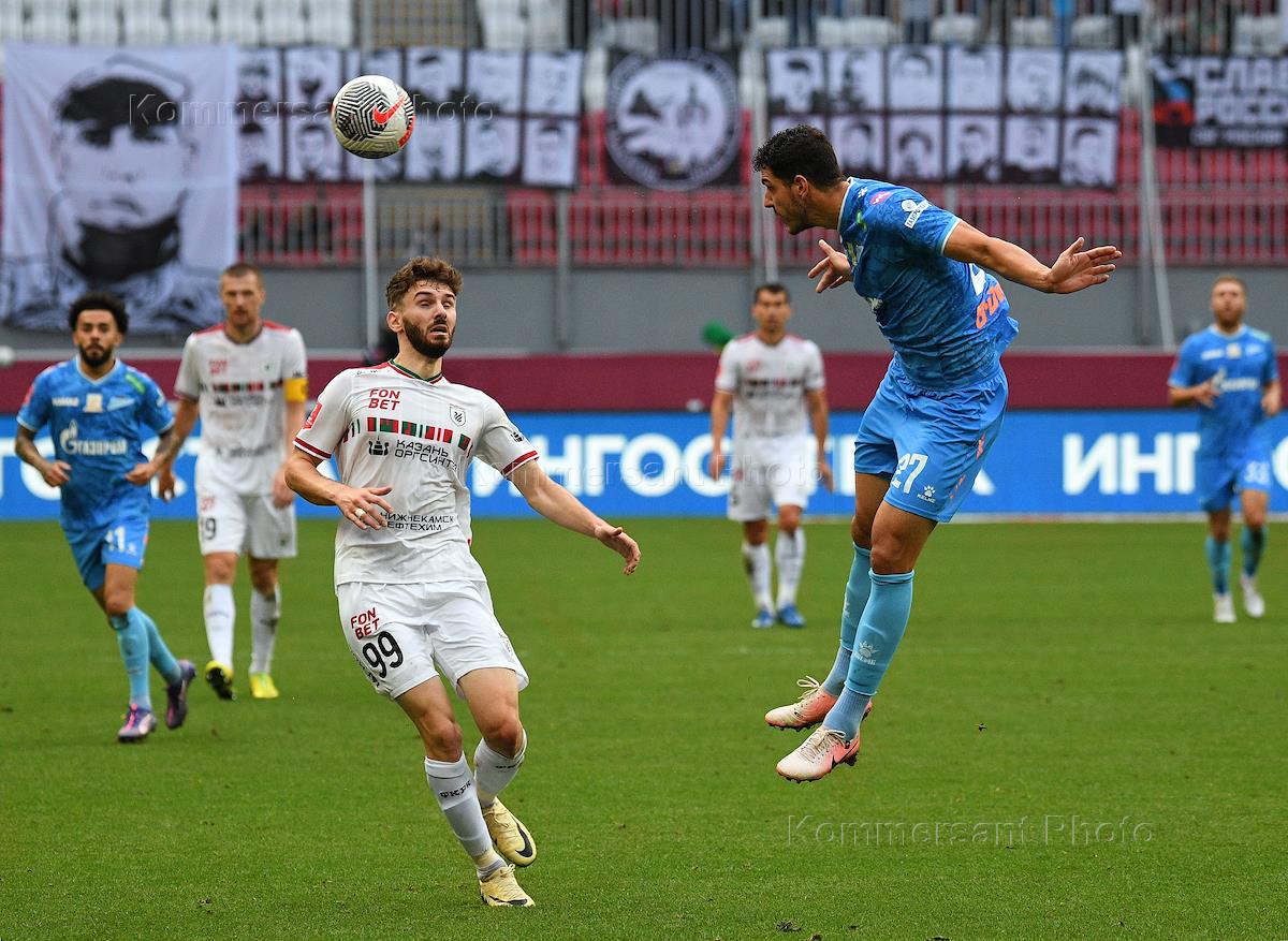 Фонбет - Кубок России по футболу 2024/25. Матч между командами "Рубин" (Казань) - "Зенит" (Санкт-Петербург) на стадионе "Ак Барс Арена". Игрок команды "Зенит" Юрий Горшков (в центре) и игрок команды "Рубин" Даниил Кузнецов (слева) во время матча.
