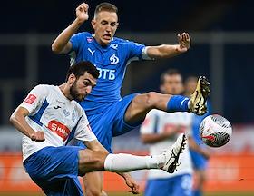 Фонбет - Кубок России по футболу 2024/25. Матч между командами "Динамо" (Москва) - "Динамо" (Махачкала) на стадионе "ВТБ Арена". Игрок команды "Динамо" Ярослав Гладышев (справа) и игрок команды "Динамо Мх" Муталип Алибеков (слева) во время матча.