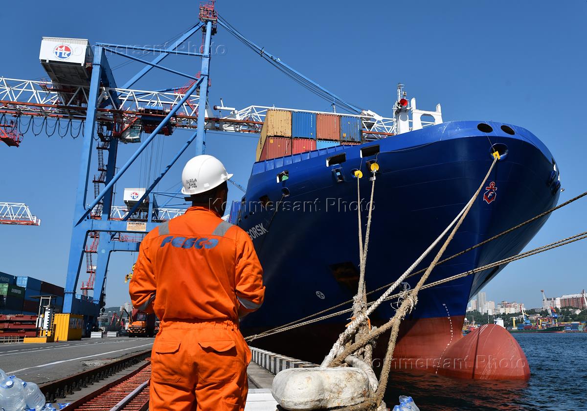 Виды Владивостока. Морской торговый порт Владивостока. Грузовые суда на причале во время разгрузки. Контейнерная площадка порта.