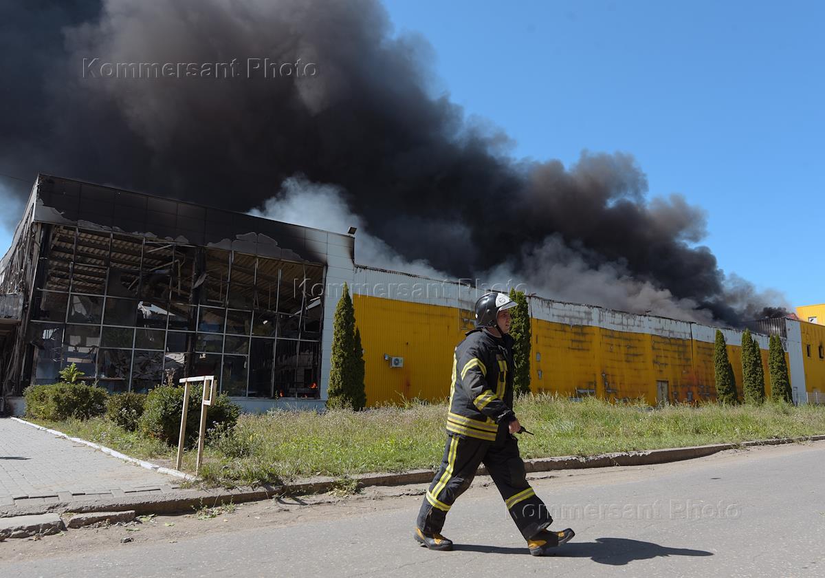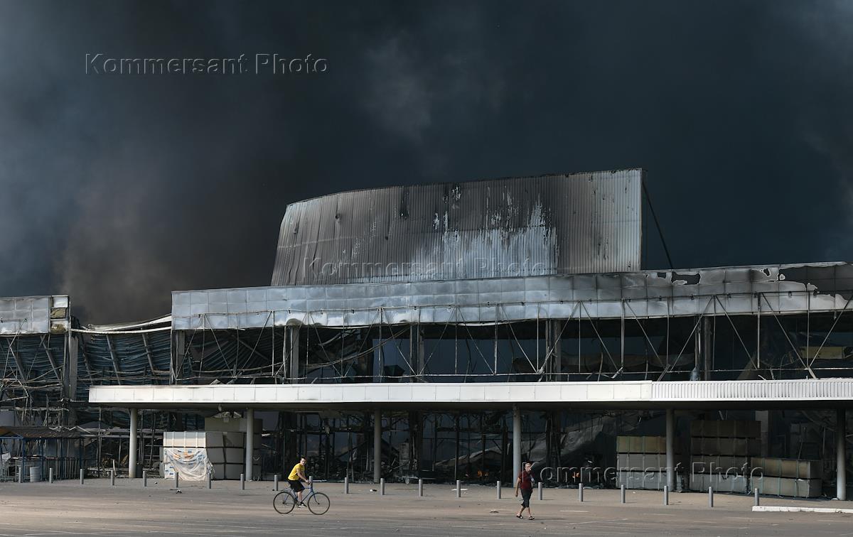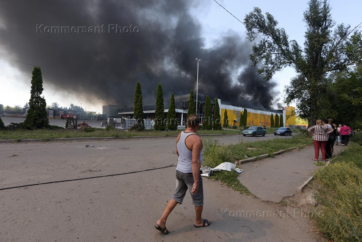 Последствия обстрела здания ТЦ "Галактика" в Петровском районе Донецка.
