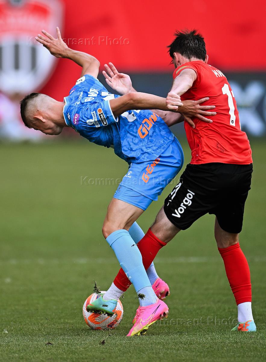 Российская Премьер-Лига (РПЛ). МИР- Чемпионат России по футболу 2024/2025. 5-й тур. Матч между командами "Химки" (Химки) - "Зенит" (Санкт-Петербург) на стадионе "Химки Арена". Игрок команды "Химки" Хетаг Хосонов (справа) и игрок команды "Зенит" Юрий Горшков (слева) во время матча.