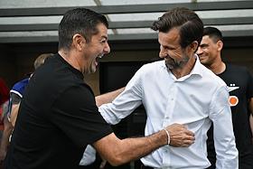 Российская Премьер-Лига (РПЛ). МИР- Чемпионат России по футболу 2024/2025. 5-й тур. Матч между командами "Химки" (Химки) - "Зенит" (Санкт-Петербург) на стадионе "Химки Арена". Главный тренер команды "Химки" Франк Артига (слева) и главный тренер команды "Зенит" Сергей Семак (справа) во время матча.