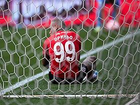 Российская Премьер-Лига (РПЛ). МИР- Чемпионат России по футболу 2024/2025. 5-й тур. Матч между командами "Химки" (Химки) - "Зенит" (Санкт-Петербург) на стадионе "Химки Арена". Вратарь команды "Химки" Игорь Обухов во время матча.