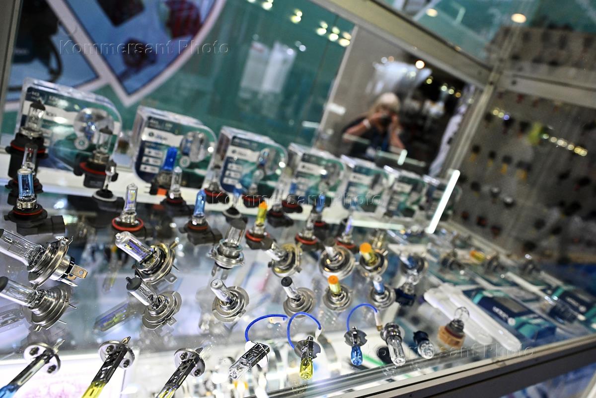 28th International Exhibition "MIMS Automobility Moscow 2024" of spare parts, auto components, equipment and goods for vehicle maintenance at Expocentre. Stand of a company producing light bulbs for cars.