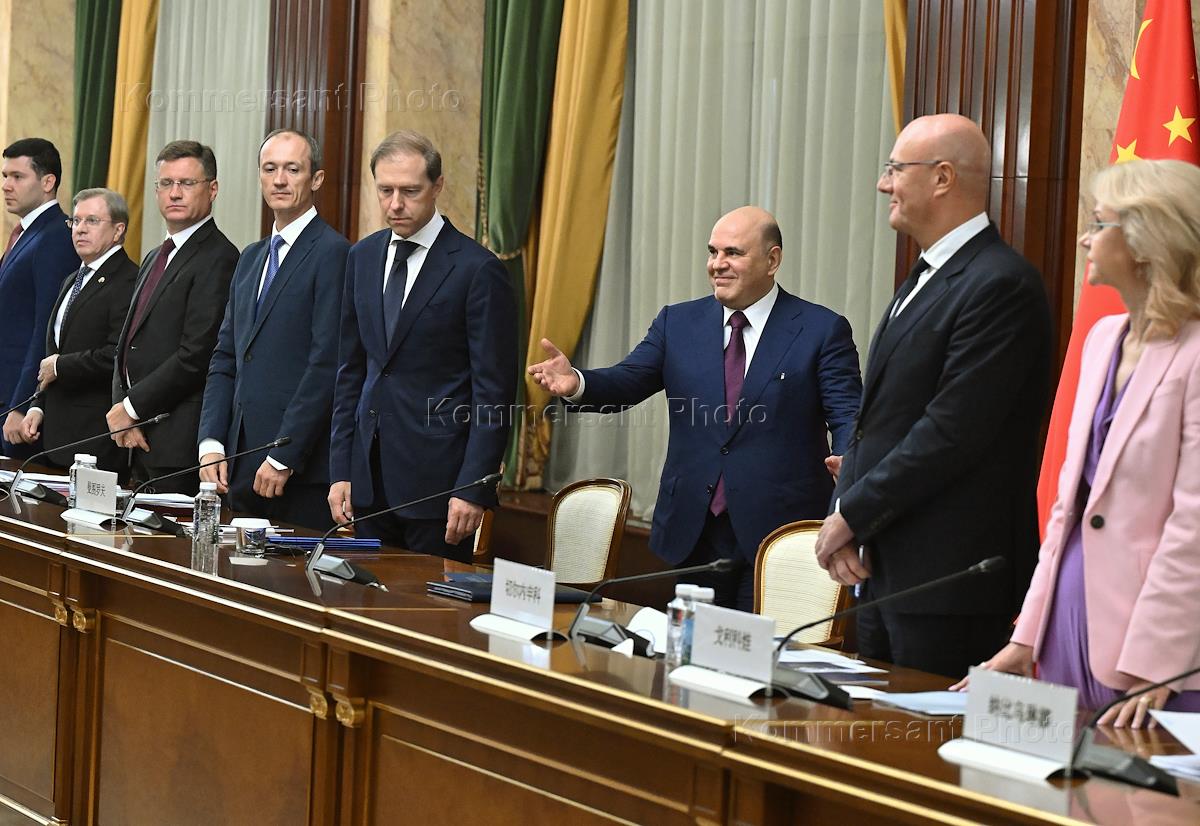29-я регулярная встреча глав правительств России и Китайской Народной Республики (КНР) в Доме правительства России. Справа налево: заместители председателя правительства России Татьяна Голикова, Дмитрий Чернышенко, председатель правительства России Михаил Мишустин, первый заместитель председателя правительства России Денис Мантуров, заместители председателя правительства России Дмитрий Григоренко, Александр Новак, Виталий Савельев и министр промышленности и торговли России Антон Алиханов во время встречи.